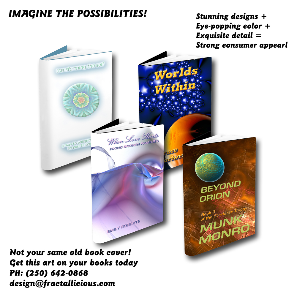 To view the screenshot above in more detail, please click on the image, then zoom in again. This gallery contains a small sampling of our many designs that we think would make spectacular book covers or illustrations. Scroll down to view some samples, or click the links above for samples of images we think are especially suitable for specific types of books. These highly evocative designs offer a novel way to illustrate abstract concepts, especially sci-fi, technical, spiritual, metaphysical, or health and wellness themed material. Rendered at 300 dpi, the fractal detail in these images reproduces beautifully in print, and the compelling beauty of their design is sure to help any book stand out on crowded store shelves. Please feel free to browse our entire