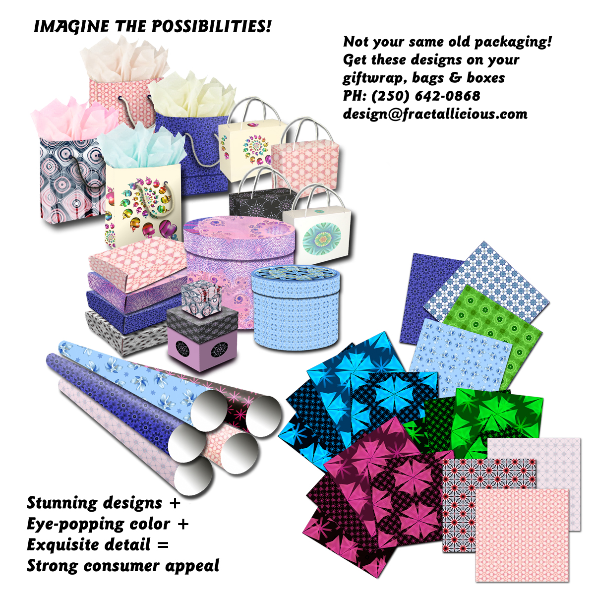 To view the screenshot above in more detail, please click on the image, then zoom in again. Or scroll down to view a sampling of our many designs that we think would make spectacular giftwrap, gift bags, gift boxes, wrapping paper, or tissue paper. Use one of our allover tiled repeats, or place an iconic image or